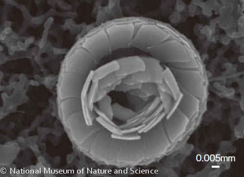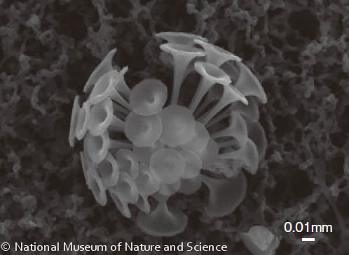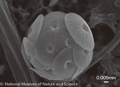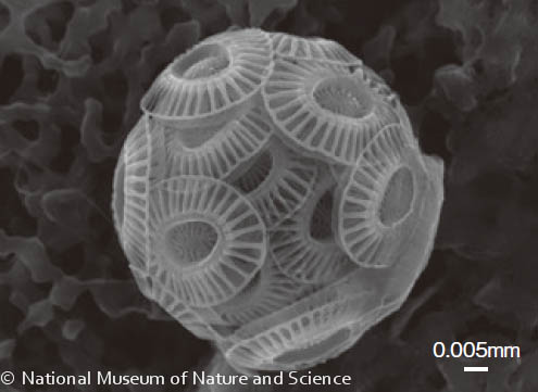 円石藻が作るコッコリスは形の変化に富んでおり、リング形、ラッパ形、板状、五角形等さまざまです。コッコリス化石の形態は、海生プランクトンの中でも進化のスピードが早いことが知られています。そのため深海底堆積物中に保存されたコッコリス化石は、海生堆積物の堆積年代を復元するための手がかりとして、深海掘削の 研究において広く研究されています。さらに、海洋環境によって群集組成が変化することから、コッコリス化石の群集解析に基づいた古海洋環境の復元にも用いられています。