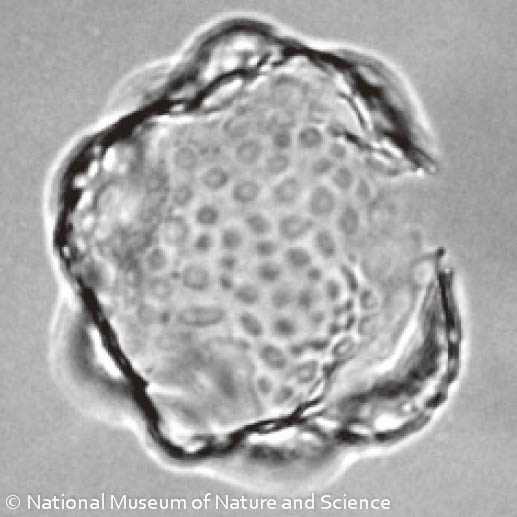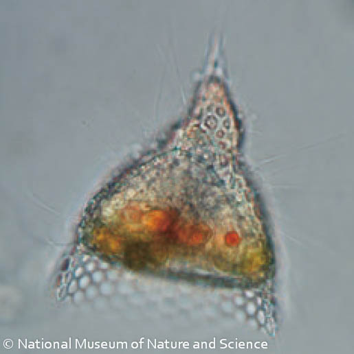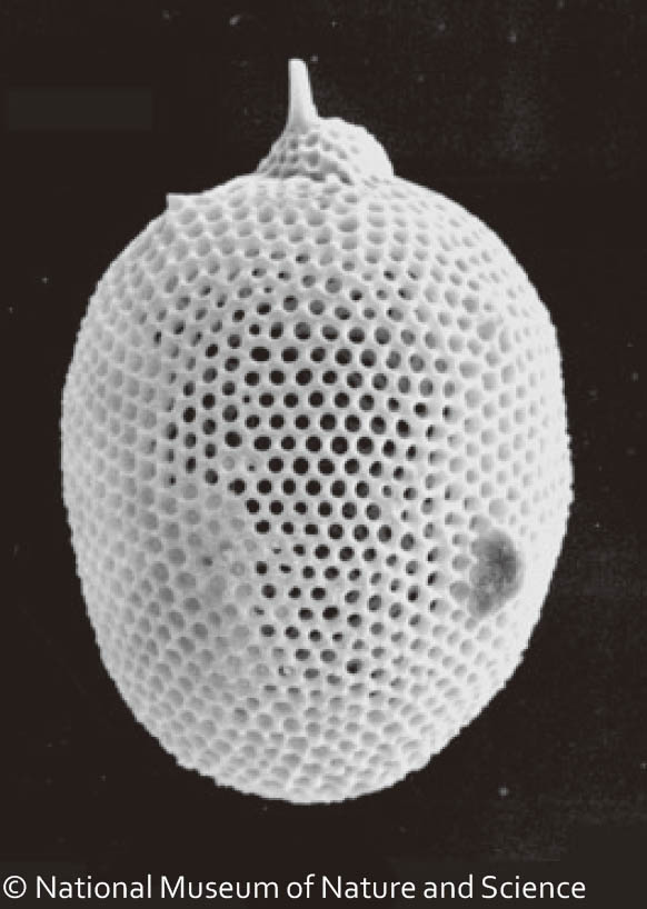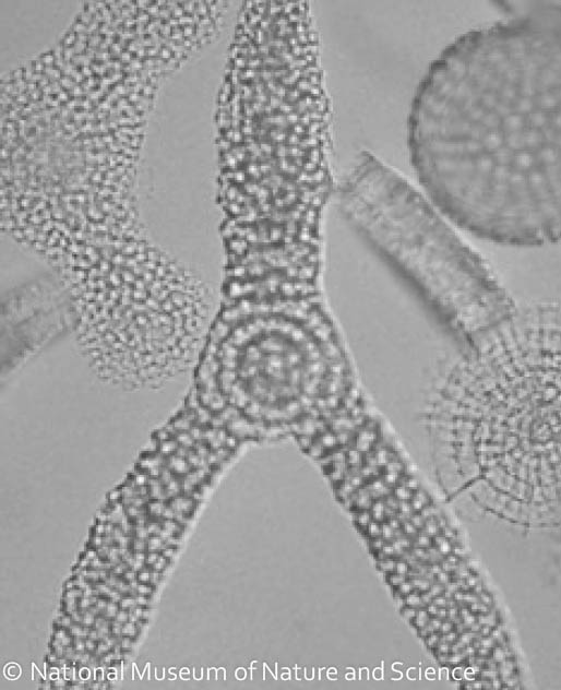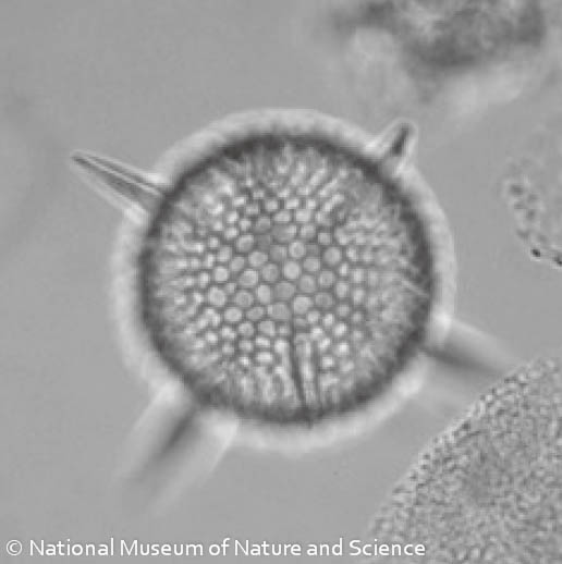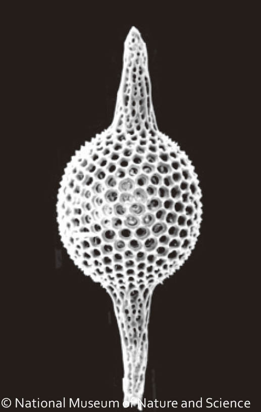 放散虫の骨格は化石になりやすく、世界中で化石が見つかっています。化石記録によれば放散虫は約5億年前に初めて出現しました。その後、様々な種が出現・絶滅を繰り返しつつ、現在に至っています。この長い歴史の中で、放散虫の骨格は様々な形態に進化してきました。細長い塔のような形の種、平たい笠のような形の種、 ディスク状の種、球状の種など、実に様々です。