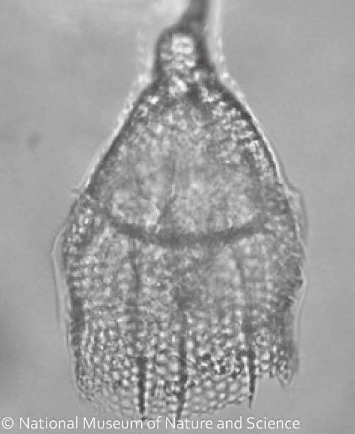 笠のような形の放散虫。円錐形の網目模様になっている部分が