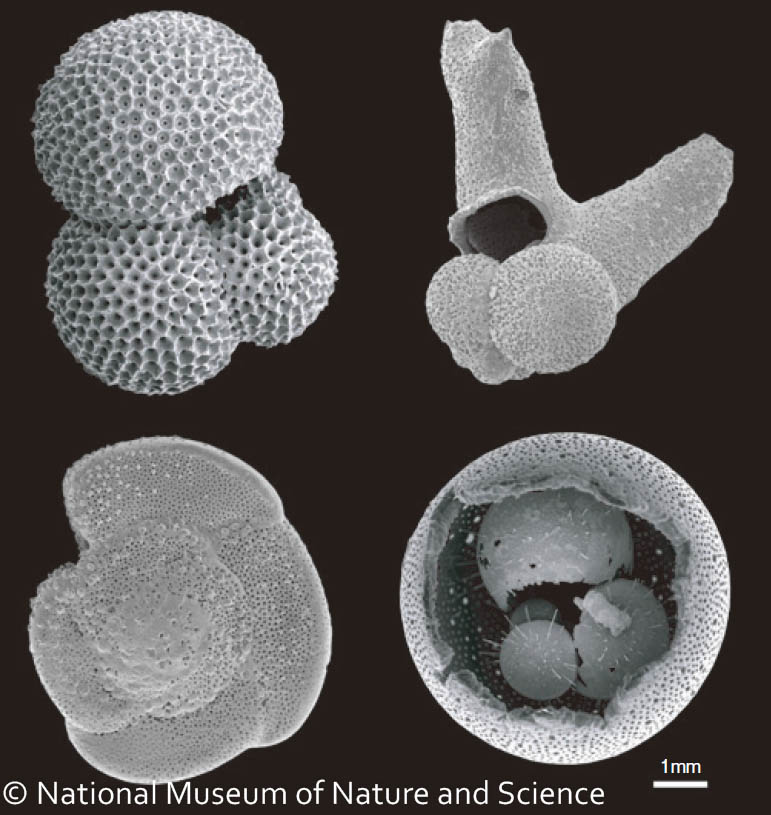 有孔虫は、世界の海に生息している小さな原生動物です。大きさは数十ミクロン(髪の毛の太さ程度)から数ミリ程度ととても小さく、顕微鏡を使ってようやくその形の詳細を知ることができます。有孔虫は海洋の表層0〜 数百mの水深に浮遊して棲んでいる