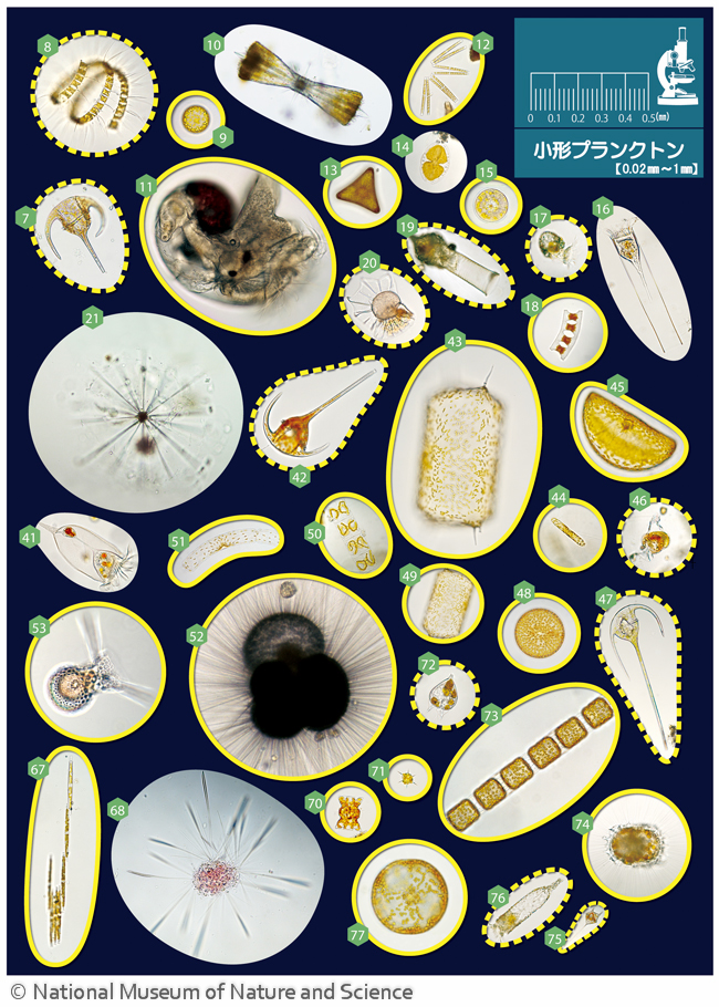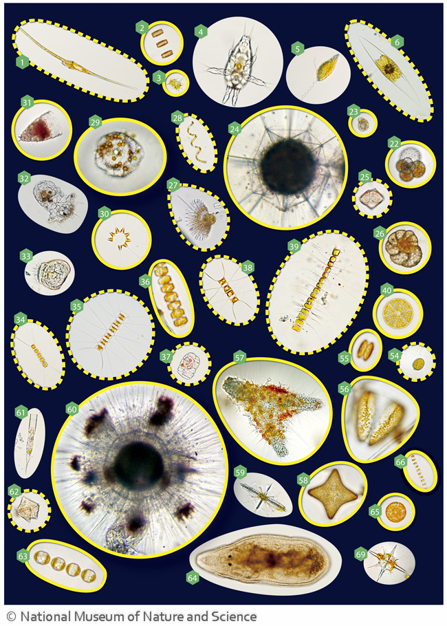 1: 渦鞭毛藻(Ceratium fusus),2: 珪藻(Thalassiosira sp.),3: 珪質鞭毛藻(Dictyocha speculum),4: カイアシ類幼生,5: ラフィド藻(Chattonella antiqua),6: 渦鞭毛藻(Pyrocystis fusiformis),7: 渦鞭毛藻(Ceratium gibberum),8: 珪藻(Chaetoceros curvisetus),9: 珪藻(Coscinodiscus sp.),10: 放散虫・アカンタリア(Diploconus fasces),11: 翼足類(Limacina inflata),12: 珪藻(Thalassionema nitzschioides),13: 珪藻(Triceratium formosum),14: 珪藻(Rhopalodia gibba),15: 珪藻(Asterolampra marylandica),16: 繊毛虫(Eutintinnus tubulosus),17: 繊毛虫(Stenosemella ventricosa),18: 珪藻(Eucampia zodiacus),19: 繊毛虫(Codonellopsis parva),20: 渦鞭毛藻(Ornithocercus steinii),21: 放散虫・アカンタリア (Phyllostaurus echinoides),22: 有孔虫(Berggrenia pumilio),23 : 底生有孔虫,24: 放散虫(Diplosphaera hexagonalis),25: 渦鞭毛藻 (Protoperidinium conicum),26: 有孔虫(Trochammina globigeriniformis),27: 渦鞭毛藻(Ornithocercus splendicus),28: 珪藻(Chaetoceros debilis),29: 放散虫(Collosphaera tuberosa),30: 珪藻(Asterionella glacialis),31: 放散虫(Spirocyrtis scalaris),32: ワムシ(Synchaeta sp.), 33: 軟体動物: 二枚貝の幼生,34: 珪藻(Chaetoceros affinis),35: 珪藻(Chaetoceros didymum),36: 珪藻(Paralia sulcata),37: 渦鞭毛藻(Polykrikos kofoidii),38: 珪藻(Chaetoceros decipiens),39: 珪藻(Chaetoceros tortissimus),40: 珪藻(Actinoptychus senarius),41: 繊毛虫 (Favella ehrenbergii),42: 渦鞭毛藻(Ceratium tripos),43: 珪藻(Biddulphia sinensis),44: 珪藻(Corethron criophilum),45: 珪藻(Hemidiscus cuneiformis),46: 渦鞭毛藻(Histioneis pietschmannii),47: 渦鞭毛藻(Ceratium pulchellum),48: 珪藻(Coscinodiscus granii),49: 珪藻 (Biddulphia levis),50: 珪藻(Streptotheca tamesis),51: 珪藻(Guinardia striata),52: 有孔虫(Globigerina bulloides),53: 放散虫(Peromelissa phalacra),54: 渦鞭毛藻(Prorocentrum compressum),55: 珪藻(Coscinodiscus angstii),56: 珪藻(Coscinodiscus granii),57: 放散虫(Euchitonia elegans),58: 珪藻(Triceratium formosum),59: 放散虫・アカンタリア(Amphibole pyramidata),60: 放散虫(Arachnosphaera myriacantha ), 61: 繊毛虫(Helicostomella subulata),62: 渦鞭毛藻(Protoperidinium conicum),63: 珪藻(Stephanopyxis nipponica),64: 扁形動物 ウズムシ, 65: 珪藻(Thalassiosira subtilis),66: 珪藻(Skeletonema costatum),67: 珪藻(Bacillaria paxillifer),68: 放散虫(Sticholonche zanclea),69: 放散虫・アカンタリア(Lonchostaurus rhombicus),70: 珪藻(Odontella aurita),71: 形質鞭毛藻(Dictyocha speculum),72: 渦鞭毛藻(Podolampas bipes),73: 珪藻(Stephanopyxis palmeriana),74: 放散虫(Tetrapyle octacantha),75: 渦鞭毛藻(Ceratium setaceum),76: 渦鞭毛藻(Tintinnopsis kofoidi),77: 珪藻(Coscinodiscus radiatus )