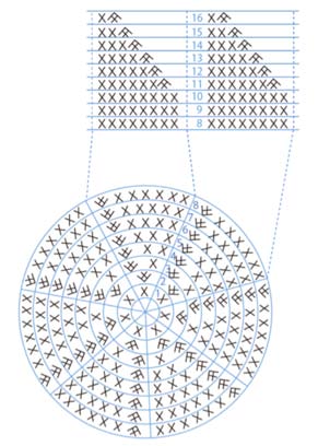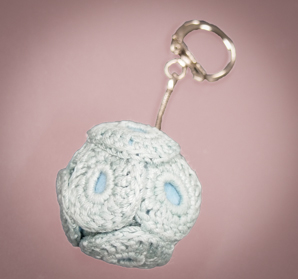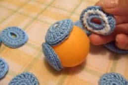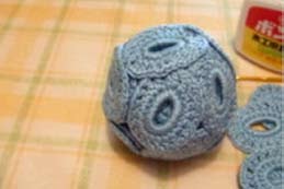 8 . ここで円石藻のトリビアを1つ.実際の円石藻では1段目と2 段目の殻(コッコリス)はお互いに噛み合うことで接合している.あみぐるみでもこれを再現してみよう. 6 .で中心部分だけボンドで接着したのはこのため.1 枚ずつ丁寧に噛み合わせながら貼りつける. ジグソーパズルのようだがあせらず,ゆっくり作業しよう.全体的なバランスにも注意を払おう.