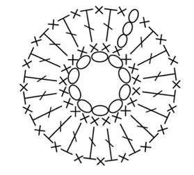 3 . 2 段目は,立ち上がりの鎖編みを3目編み,長編み+ 鎖+長編み+鎖……と1 周編む.編み終わりには最初の目の頭に針を入れ,きつく引き抜く.