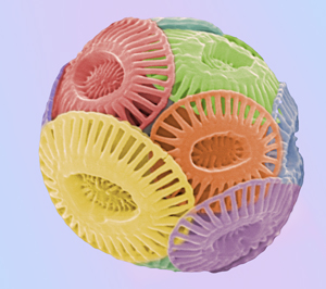 円石藻エミリアニア・ハクスレイ 実物の顕微鏡写真。(重なりが分かりやすいように着色しています)