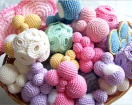 1 . ここでは手のひらに乗るくらいの大きさのものを作成する.所要時間は2〜3時間.使用する糸はレース糸#20,自分の自由なイメージで,いろんな色の有孔虫をつくってみよう.編みはじめは,指に糸を2 回巻きつけて輪をつくり,そこに細編みを7 目編む.