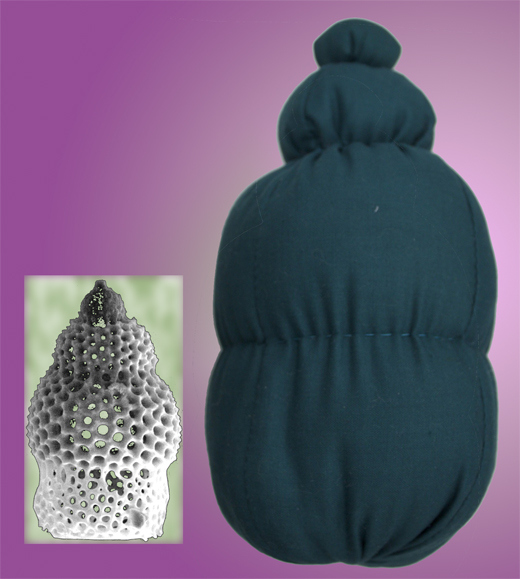 2. A の周りを5mm程度の幅でぐしぬいし,綿をつめて縫い絞り,球をつくる.