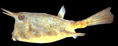 A pair of sharp, strong horns about twice eye diameter in length projecting anteriorly from front of head. A second pair of horns extending posteriorly from posteroventral corner of carapace. Caudal fin greatly elongate, one half to two-thirds of carapace length. Color: body yellowish brown with light blue spots on sides; dorsal, anal, and pectoral fins pale; caudal fin yellowish with light blue spots. Size: maximum 50 cm, commonly to 30 cm. Distribution: widely distributed in tropical Indo-West Pacific from East Africa eastward to Marquesas Islands, north to southern Japan. Remarks: occurring in weedy areas near rocks or reefs.